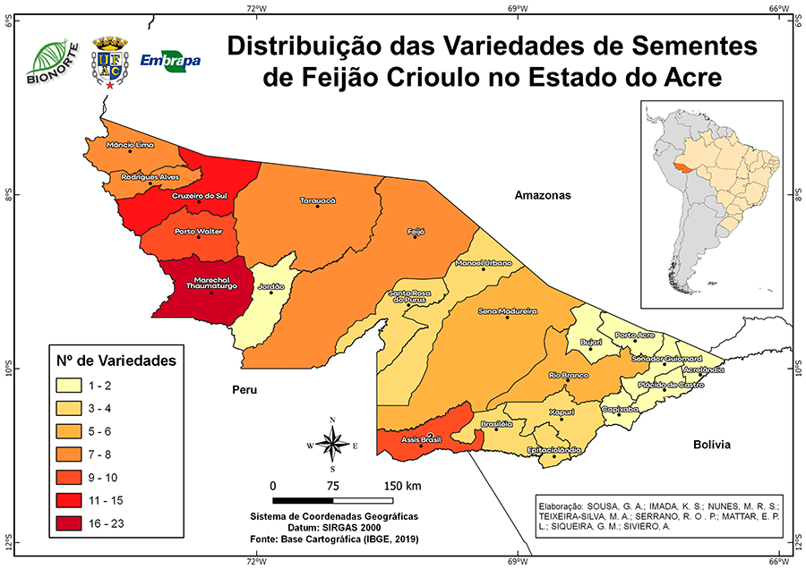 | Mapa da diversidade de feijões Durante três anos, foram avaliadas 14 variedades de feijões cultivados ao longo dos rios Juruá, Breu, Tejo e Amônia, em Marechal Thaumaturgo — município que concentra a maior diversidade de feijões do Acre. O levantamento confirmou a forte ligação da agricultura local com a biodiversidade regional, em especial no Vale do Juruá, que reúne grande número de variedades tanto de feijão-comum (Phaseolus vulgaris) quanto de feijão-caupi (Vigna unguiculata).Outra parte da pesquisa foi a sistematização da ocorrência de variedades crioulas que ocorrem em todo estado do Acre. Esse trabalho resultou na elaboração do mapa da distribuição de variedades de feijões comum e feijão-caupi cultivados no Acre. Siviero explica que o cultivo dessa leguminosa ocorre em todos os municípios acreanos, mas a maior diversidade de variedades encontra-se no Vale do Juruá.Em Marechal Thaumaturgo foram constatadas 23 variedades de feijões, revelando ser a região com maior ocorrência de espécies crioulas do Acre. O acesso ao município é realizado apenas por via fluvial ou aérea, fator que reforça a importância da produção local para a segurança alimentar da região.“Vimos que enquanto o cultivo do feijão-comum é desenvolvido em terra firme, o feijão-caupi é cultivado em áreas de várzeas, em pequenos roçados de um hectare, por agricultores familiares. Já na região do Baixo Acre, a mais populosa do estado, predomina o cultivo de apenas três variedades do grão”, destaca Siviero.“O Vale do Juruá pode ser considerado um dos principais centros de conservação on farm de feijões caupi e comum do mundo”, afirma o professor da Universidade Federal do Acre (Ufac) Eduardo Pacca, que também realiza pesquisas sobre agrobiodiversidade da região. Foto ao lado: feijão-caupi preto |